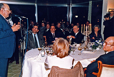 Goetschys Reden (links) waren im Senat ebenso berühmt wie berüchtigt: Er flocht gerne elsässische Sprüche ein, wie hier bei seinem Toast an der Ehrentafel mit Giscard (rechts) und Haeberlin (gegenüber). Foto J.-P. Lienhard, Basel © 2011