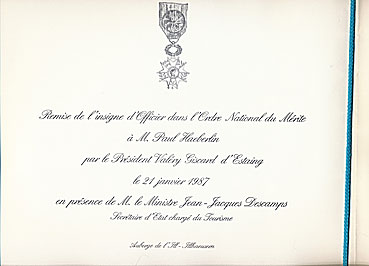 Als am 21. Januar 1987 der französische Staatspräsident Valéry Giscard d‘Estaing in Illhäusern Paul Haeberlin den Orden eines «Officier dans l‘Ordre National du Mérite» verlieh, lag Schnee auf den Ästen der mächtigen Trauerweide vor der Auberge de l‘Ill - und es war ein Freudentag für die ganze Familie. Die Trauerweide vor der Herberge trug am Samstagmorgen, 10. Mai 2008, schon ein grünes Kleid, als Paul Haeberlin im Kreise seiner Angehörigen friedlich entschlief. Ein Blick in die Dokumente, die ich von der Ordensverleihung aufbewahrt habe, mag einen grossen Moment erhellen, auch wenn er dem Leben des Verstorbenen keine umfassende Würdigung geben kann.