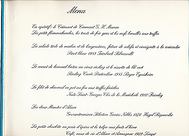 Das Menü ist es wert, ausführlich beschrieben zu werden. Und zwar vorab aus dem Grund, weil es eine grosse Reverenz an die einheimischen Produzenten und Freunde von Paul Haeberlin ist: Eine grosse Küche und ein grosser Künstler des Geschmackssinns kann sich nur entfalten, wenn auch das Material für die Schöpfungen von erstklassiger Güte sind. Paul Haeberlin verstand es hervorragend, die besten elsässischen und französischen Winzer für sich und deren Produkte für sein Haus zu gewinnen.