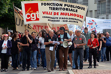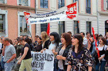 Kämpferische junge Frauen der CGT - sie äussern sich dezidiert gegen Sarkozy und Bockel, der Mülhauser Bürgermeister, Sozialist und Minister von Sakozys Gnaden.