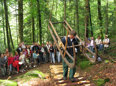 Auf dieser Wanderstation kann man erleben, wie die Holzschlittenführer in atemraubendem Tempo riesige Holzbeigen aus dem Wald ins Tal schleifen liessen, bevor die Traktoren diese gefährliche Arbeit übernahmen. Foto: Marbach-et-Schwebel, St-Amarin © 2008