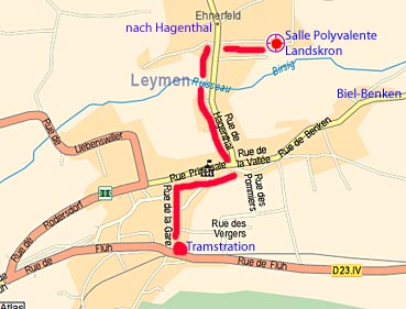 ab Station Leymen. Zirka 15 Minuten Fussmarsch durch die rue de la Gare hinunter bis zur Hauptstrasse rue Principale, dann rechts bis zur Strasse nach Hagenthal links zirka 250 Meter bis zur rue du Stade.