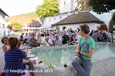 Vor der Aufführung wird stimmungsvoll vor den Mauern der Wehrkirche St. Arbogast gepicknickt. Wer zu spät kommt, muss halt am Brunnenrand essen… © foto@jplienhard.ch 2013