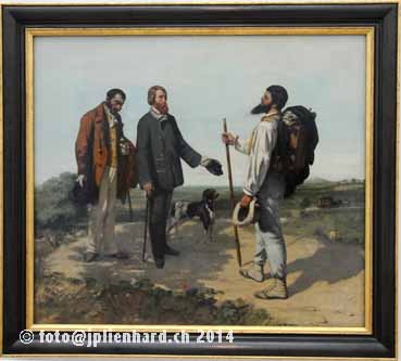 «Bonjour Monsieur Courbet», sagt sein Mäzen in Begleitung des demütig zu Boden blickenden Dieners, und so heisst das Gemälde auch. Kunsthistoriker haben in diesem Meisterwerk allerhand Gelegenheit zu teils abenteuerlichen Interpretationen: Ist der Hund nun blind? Hat Courbet den Schatten der beiden anderen «vergessen» oder absichtlich weggelassen, was metaphorisch sagen könnte, dass sie in Courbets Schatten stehen? Und die Kutsche? Hat sie die beiden abgeladen? Was soll der spitz ausgestreckte Bart des Künstlers bedeuten? Dominique Font-Réaulx jedenfalls weiss, dass Courbet sehr eitel stolz auf seinen Bart war. foto@jplienhard.ch © 2014