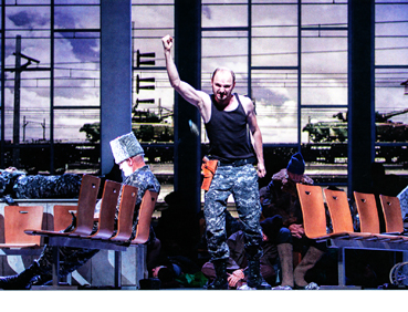 Das Bühnenbild. Im ersten der fünf Akte wird der Tarif der Inszenierung durchgegeben: Wohl ein kriegsversehrter Bahnhof. Ein echter Güterwagen steht auf den beiden Geleisen, die offenbar kurz zuvor Kriegsschauplatz waren. Zivile Opfer liegen herum, und deren Kadaver werden von Milizen mit respektlosem Schwung in den Güterwagen geschmissen. Keine Puppen, sondern Chor-Mitglieder. Links und rechts der Geleise verbinden hohe Treppen die Perrons: Man kann sich unschwer die Treppenaufgänge zu der Passerelle im Basler Bahnhof SBB vorstellen (Bühnenbild: Zinovy Margolin). Doch, was hier Theater ist, findet sich auf Youtube massenweise und echt: Per Handy aufgenommene Greueltaten an Zivilisten und an Kriegsgefangenen, an die das Theater selbst in «lebensechter» Bühnendarstellung nie hinreicht. Zum Glück für das Basler Publikum.