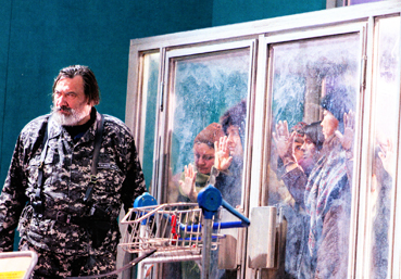 Die Aufführung. Auch im Theater Basel ist jetzt Multimedia angekommen und setzt damit ein zusätzliches Stilmittel in Szene: Nach jedem Akt fährt eine Leinwand von immensem Ausmass des gesamten Bühnenrahmens herunter, worauf zum Bühnenbild korrelierende Videosequenzen mit winterlichen Geleiselandschaften, wohl von der Sibirischen Eisenbahn, ablaufen und damit die Wartezeit der Bühnenbild-Umbauten ausfüllen. Die schwarzweiss gehaltenen Aufnahmen im Schnee lassen buchstäblich frösteln. Mit der Ouvertüre erscheinen in Abständen Schriftzüge, die die Entfernung «zur Hauptstadt» anzeigen, und gleichzeitig zeigt das Video den jeweiligen Bahnhof. Beginnend bei Altstätten ZH und wohl endend bei Wladiwostok bei Kilometer 15’000. Damit scheint die Regie beabsichtigt zu haben, durch die in Tausenderschritten eingeblendeten Distanzen und der gefilmten menschenleeren Landschaften eine Ahnung des russischen Raumes zu vermitteln. Schade nur, dass der Zuhörer bei der wunderschönen Ouvertüre durch die Aufnahmen vorbeiflitzender Züge am Hörgenuss abgelenkt wird. Bewegte Videobilder zu Musik sind sowieso höchst problematisch!