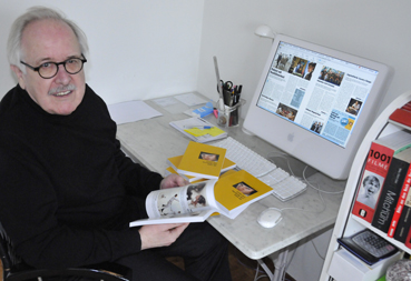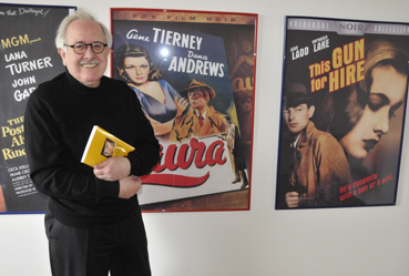 Ottokar Schnepf mit seinem Filmbuch vor den Filmplakaten seiner geliebtesten Filmwerke. foto@jplienhard.ch © 2015