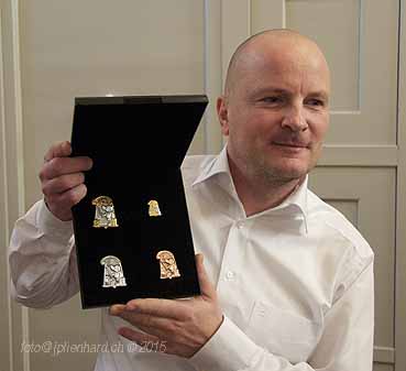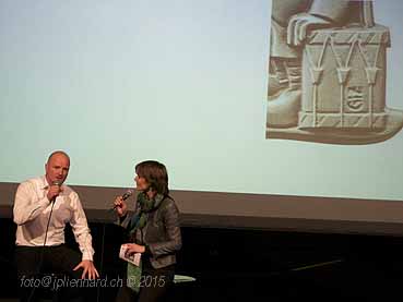 Comité-Mitglied und SRF-Moderatorin Nicole Salathé interviewt an der Blagedde-Vernissage der Cliquen-Obleute den Entwerfer Guido Happle. GIZ, wie er sich nennt und sich so auch auf der Plakette verewigte, brachte den Saal zum Schmunzeln, als er der Nicole schlagfertig erwiderte, dass er, weil er in Basel zuhause ist, eben nach Lörrach und Weil einkaufen gehen kann, während sie eben - ätsch-bätsch - in Zürich wohnt… © foto@jplienhard.ch 2015