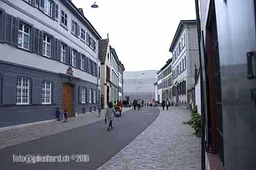 Schaut man am Ende der Rittergasse durch diesen historischen Gebäude-Korridor Richtung St.-Alban-Vorstadt, so erscheint einem der nun von allen Gerüsten befreite Neubau wie eine graue Staumauer eines Stausees. Das Grau stammt von dänischen, flachen Ziegelsteinen, die immerhin eine Struktur haben, die sich im Spiel mit Licht und Schatten der Tageszeit verändert. Wenngleich Emanuel Christ von der Wirkung eines Platzes sprach, den nun die beiden Gebäude am Anfang der Dufourstrasse darstellen sollen, dann wird sich nach der Eröffnung der beiden neu- und umgebauten Kunstmuseums-Bauten am kommenden Sonntag weisen müssen, wie das Publikum das neue Stadtbild aufnimmt.