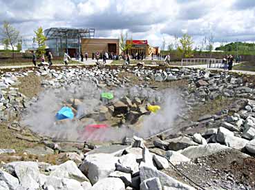 Wie? Ja wie? Der Park ist von der Schweizer Landschafts-Architektin Ursula Kunz, französisch in Paris aufgewachsen, rund um ein Loch herum konzipiert worden. Das Loch mit etwa 20 Meter Durchmesser ist das «Auge» des Parks, und es soll einen Meteoriten-Krater darstellen. Ein Meteorit ist denn tatsächlich im ausgehenden Mittelalter wenige Kilometer entfernt in der vorderösterreichischen Residenzstadt Ensisheim niedergegangen - ein Aufhänge-Thema des Funparks also. Also steigen aus dem Loch aus unzähligen Wasserdüsen «Dämpfe» und beschlagen einige farbig bemalte Quadersteine…