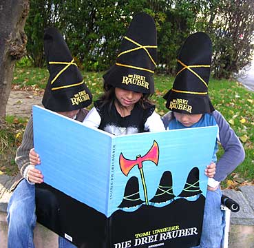 Das Buch «Die Drei Räuber» ist so schön, und die Bilder darin wirken noch schöner, wenn sie ganz gross sind, so dass der Diogenes-Verlag in Zürich eine Sonderauflage in der Grösse von drei Käsen hoch herausgibt - damit gleich drei «Räuber» aufs Mal darin herumstöbern können. Foto: J.-P. Lienhard, Basel © 2007