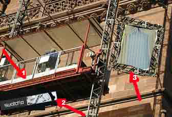 Für die Demontage der Sonnenuhr und der Montage der digitalen Swatch-Uhr musste das Baudepartement Basel einen Aussenlift an den Münsterturm bauen. Auf dem mit Teleobjektiv aufgenommen Bild zeigt Pfeil 1 auf die flache Kiste mit der noch «geheimen» Digital-Uhr. Pfeil 2 zeigt unter der Arbeitsplattform eine Version des Logos der Swatch und Pfeil 3 verweist auf den für die morgige Enthüllung angebrachten Vorhang. Foto: J.-P. Lienhard, Basel © 2004