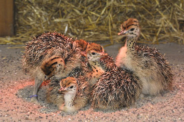 Gegenwärtig auch im Zolli zu sehen: Im Stall der Straussenvögel sind aus dreizehn Eiern neun stachelig-flauschige Küken geschlüpft, das letzte am 2. Januar 2009. Das Daunenkleid der Mini-Strausse erinnert an Igel und tarnt in der Grassavanne perfekt. Erst mit drei Monaten und etlichen Kilogramm mehr auf den Rippen, wird den Kleinen das bräunliche Jugendkleid wachsen. Bei den zurzeit winterlichen Aussentemperaturen kuscheln sich die Mini-Strausse unter die wohlig wärmenden Infrarotlampen im Straussenhaus.