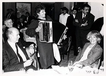 Ständchen für den ehemaligen Präsidenten der Republik und seiner Gattin, Anna-Aymone Sauvage de Brantes, dargebracht von der bekannten Akkordeonistin Danielle Pauly, einer Freundin des Hauses Haeberlin in Illhäusern. Aufgenommen am 21. Januar 1987 von Foto J.-P. Lienhard, © 2020