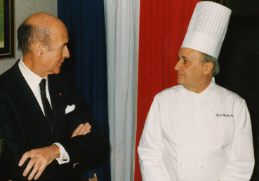 Valérie Giscard d’Estaing mit dem berühmtesten Elsässer und einem der berühmtesten Köche in Frankreich in seiner Zeit: Paul Haeberlin, Dreisterne-Koch in Illhäusern. Mit auf dem Bild ganz links: Paul Bocuse, Erfinder der «Nouvelle Cuisine». Aufgenommen am 21. Januar 1987 von Foto J.-P. Lienhard, © 2020