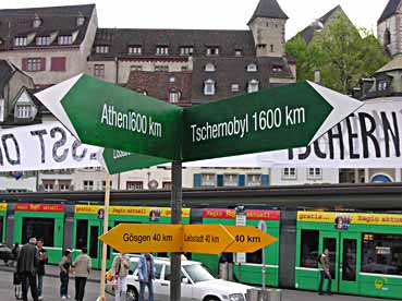 Vielsagender Wegweiser: Die Atomstrahlen von Tschernobyl drangen 1600 Kilometer von dort bis zu uns - die schweizerischen AKWs Gösgen, Leibstadt und Mühleberg sind etwas mehr als 40 Kilometer von Basel entfernt… Alle Fotos: J.-P. Lienhard, Basel © 2005