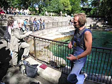 Die berühmtesten Zolli-Mitarbeiter: Affenforscher Jörg Hess (mit Notizblock, links) und Seelöwen-Tierpfleger Markus Ruf (rechts) vor dem Becken mit den schwimmenden Säugern aus Kalifornien. Alle Fotos: J.-P. Lienhard, Basel @ 2005