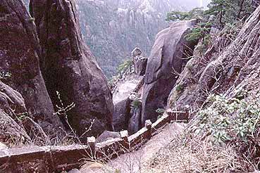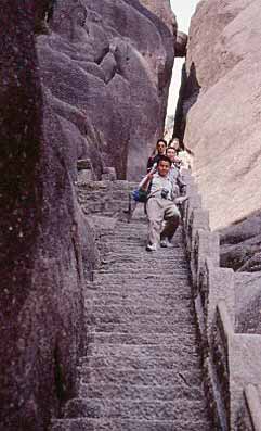 Wer die Gelben Berge besucht, muss sich darauf einstellen, zahllose Treppen und Stufen hinauf zu kletten und in die Tiefe zu steigen.