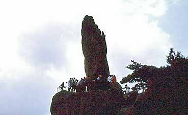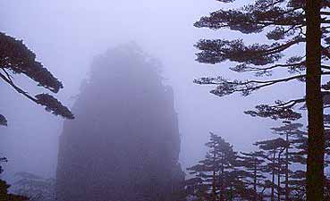 Am dritten Tag herrschte morgens dicker Nebel, und mein Begleiter führte mich auf neuen Wegen durch das Berglabyrinth. (Es gab nur Wegweiser in chinesischer Sprache. Dafür viele Fremdenführer für ein paar Ausländer.) Nie und nimmermehr würde ich den Weg allein gefunden haben. Manchmal lichteten sich die Nebelwolken, und die Umrisse einer Felsformation mit Kiefern traten in Erscheinung und schwammen gleich wieder davon. Oder sie gaben den Blick frei auf einen tiefen Taleinschnitt oder auf einen Gipfel, der unbeschreiblich hoch über mir lag.