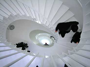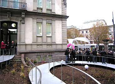 Das Publikum kann nicht schnurstracks den Eingang betreten, sondern muss ihn über eine lange Rampe in Schlangenlinie erreichen. Ein witziges Detail und eine der Abertausenden von Ideen Tomis.