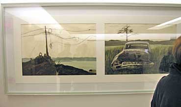 Auch Tomi hatte an der Vernissage für geladene Gäste eine Ansprache gehalten, eine Dankesrede. Geduldig wartet seine Frau Yvonne auf dem Sofa, bis er drankommt.