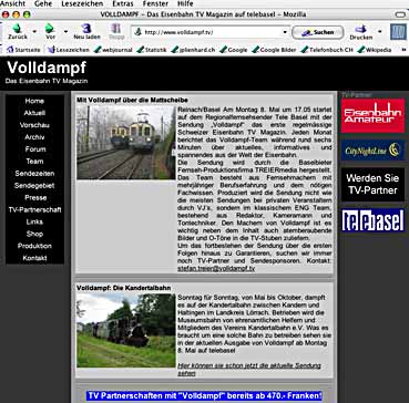 BASEL/KANDERN. st.- Am Montag, 8. Mai 2006, um 17.05 Uhr startet auf dem Nordwestschweizer Fernsehsender «TeleBasel» mit der Sendung «Volldampf» das erste regelmässige Eisenbahn-TV-Magazin der Schweiz. Jeden Monat berichtet das «Volldampf»-Team während rund sechs Minuten über Aktuelles, Informatives und Spannendes aus der Welt der Eisenbahn.