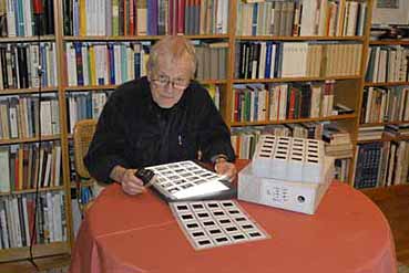 Buchautor und webjournal.ch-Publizist Aurel Schmidt mit einer winzigen Auswahl der «Erinnerungsfotos» von seinen Reisen in die Welt. Foto: J.-P. Lienhard, Basel © 2007